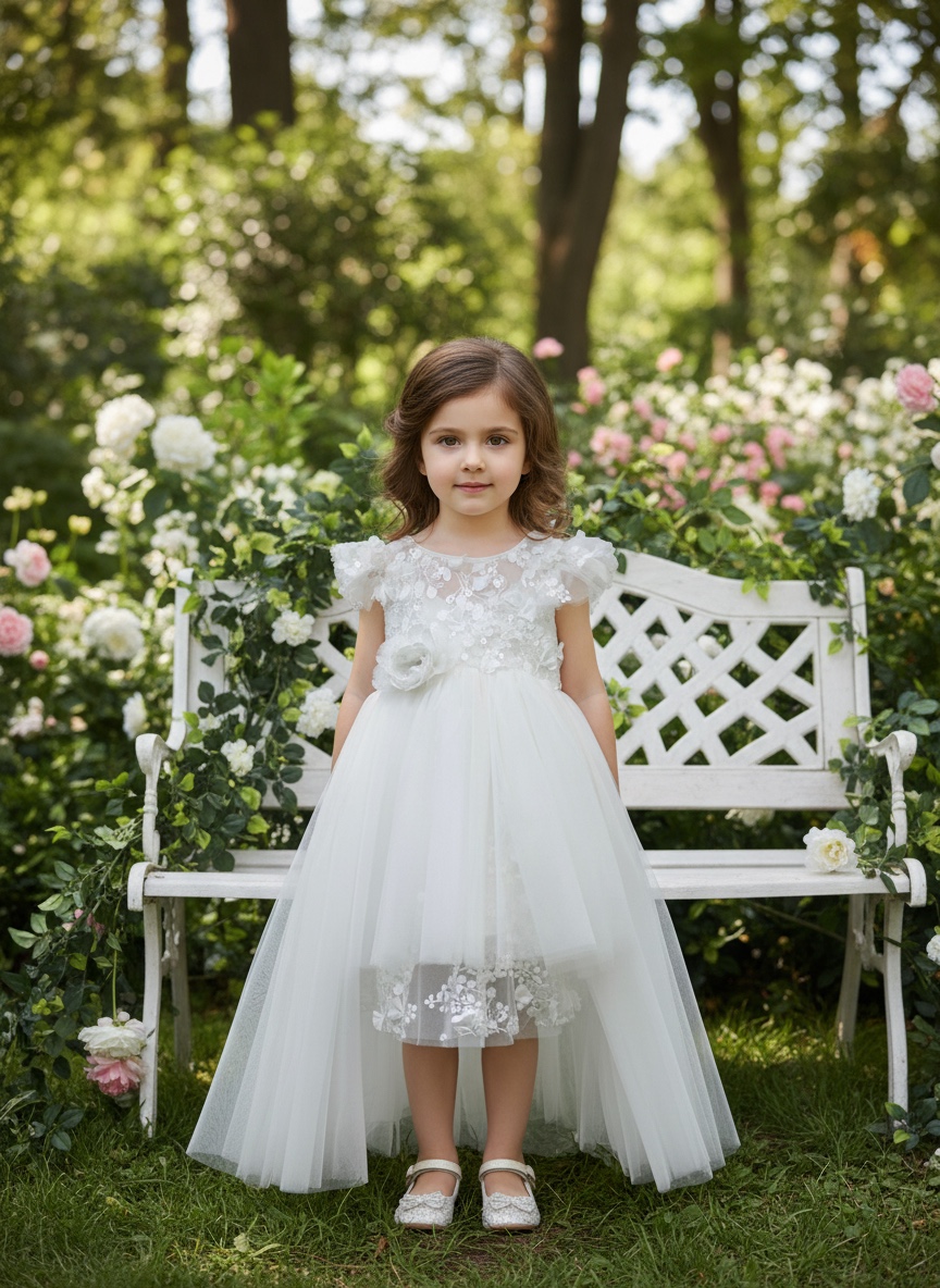 Ρομαντικό βαπτιστικό φόρεμα με ιδιαίτερη γραμμή και παραμυθένια αισθητική. Μπούστο από φίνα δαντέλα με ανάγλυφα κεντήματα και κομψές λεπτομέρειες. Φούστα από πολυεπίπεδο τούλι με αέρινη υφή και εντυπωσιακή δαντελένια ουρά στο πίσω μέρος που χαρίζει κίνηση. Εσωτερική βαμβακερή φόδρα για άνεση και σωστή εφαρμογή. Διακοσμητικό λουλούδι στη μέση που ολοκληρώνει την ρομαντική αισθητική. Χρώμα: Εκρού